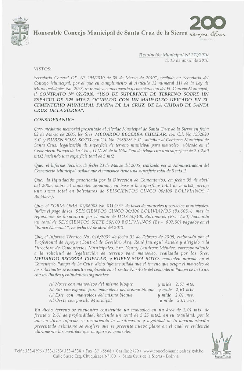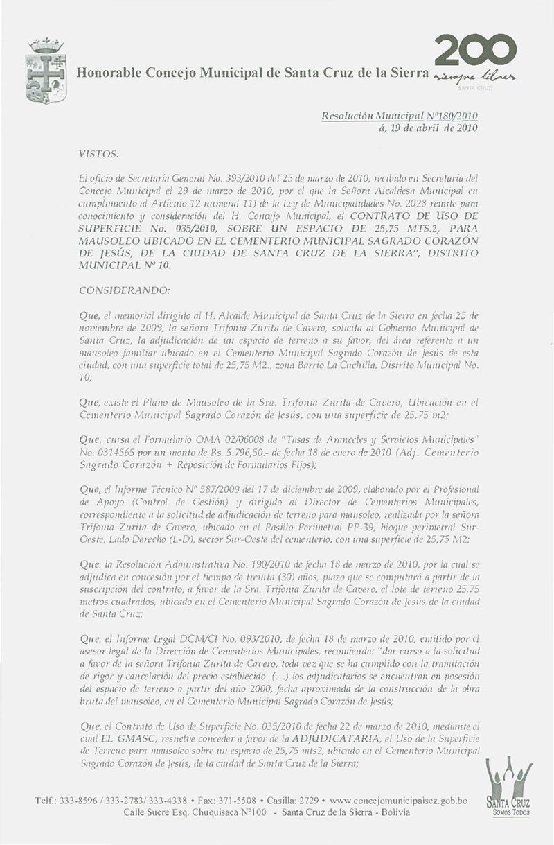 Aprueba el Contrato Nº 035/2010, referente al Uso de Superficie de Terreno, ocupado con un Mausoleo ubicado en el Cementerio Sagrado Corazón de Jesús, a favor de la Sra. Trifonia Zurita de Cavero.