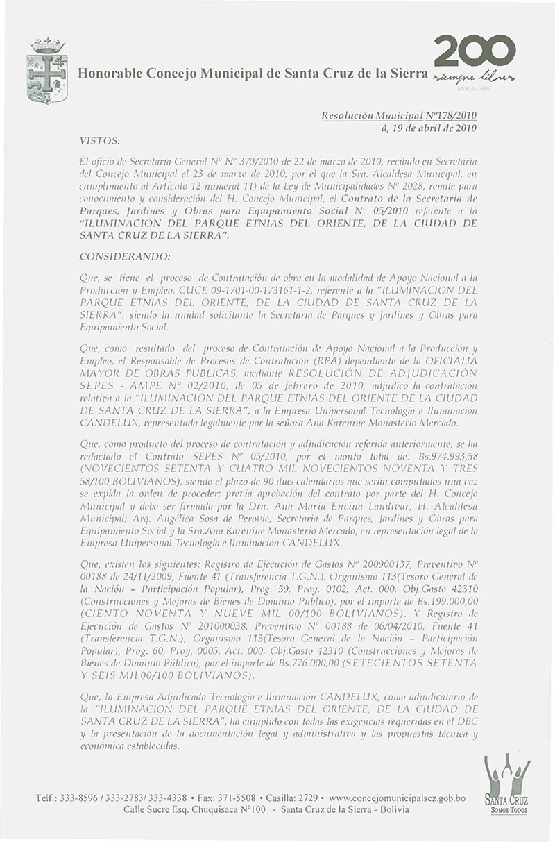 Aprueba el Contrato de la Secretaría de Parques y Jardines Nº 005/2010, referente a la "Iluminación del Parque Etnias del Oriente" del Distrito Municipal Nº 7, por el monto de Bs. 974.993,58.