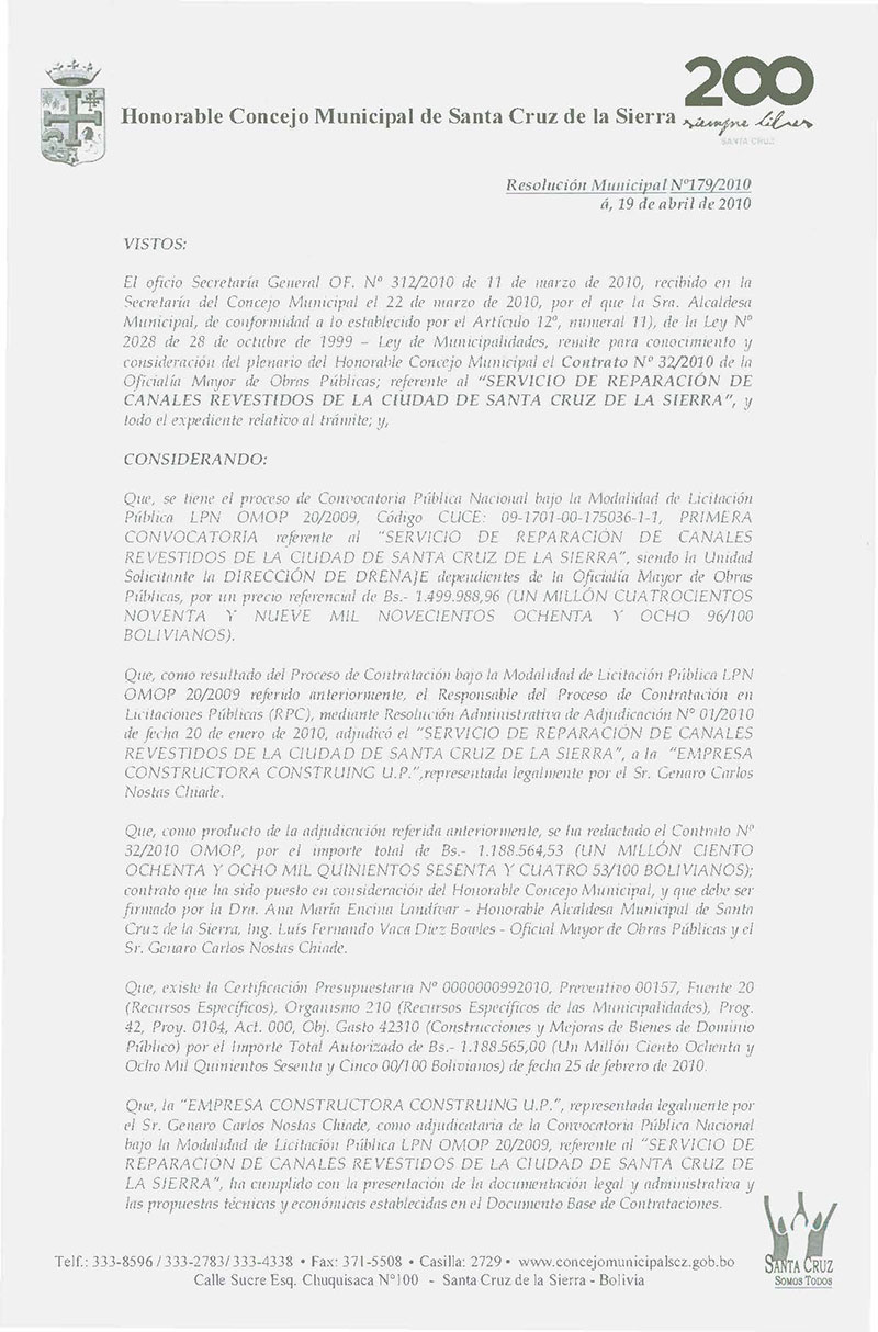 Aprueba el Contrato OMOP Nº 032/2010, referente al Servicio de reparación de Canales revestidos de la Ciudad, por el monto de Bs. 1.188.564,53.