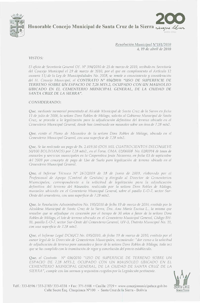 Aprueba el Contrato Nº 036/2010, referente al Uso de Superficie de Terreno, ocupado con un Mausoleo ubicado en el Cementerio General, a favor de la Sra. Dora Robles de Málaga.