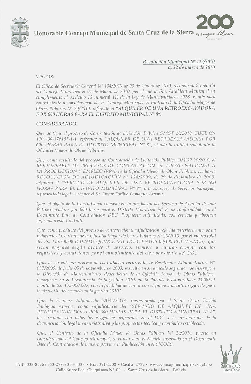 Aprueba el Contrato OMAP Nº 020/2010, referente al Alquiler de una Retroexcavadora para el Distrito Municipal Nº 8, por Bs. 115.200,00.
