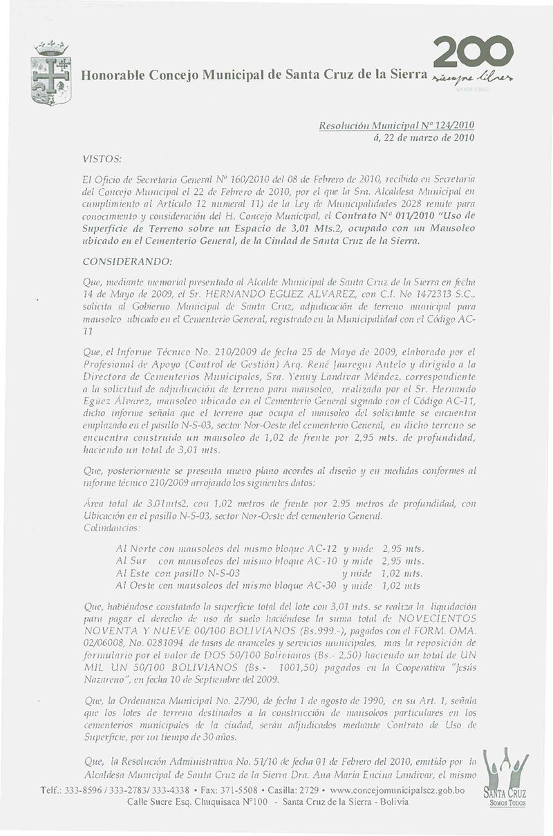 Aprueba el Contrato Nº 011/2010, referente al Uso de Superficie de Terreno, ocupado con un Mausoleo ubicado en el Cementerio General, a favor del Sr. Hernando Eguez Alvarez.