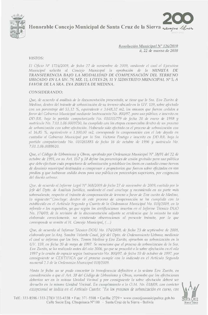 Aprueba la Minuta de Transferencia de Lotes de Terreno, en compensación a favor de la Sra. Eva Zurita de Medina, ubicados en la U.V. 79.