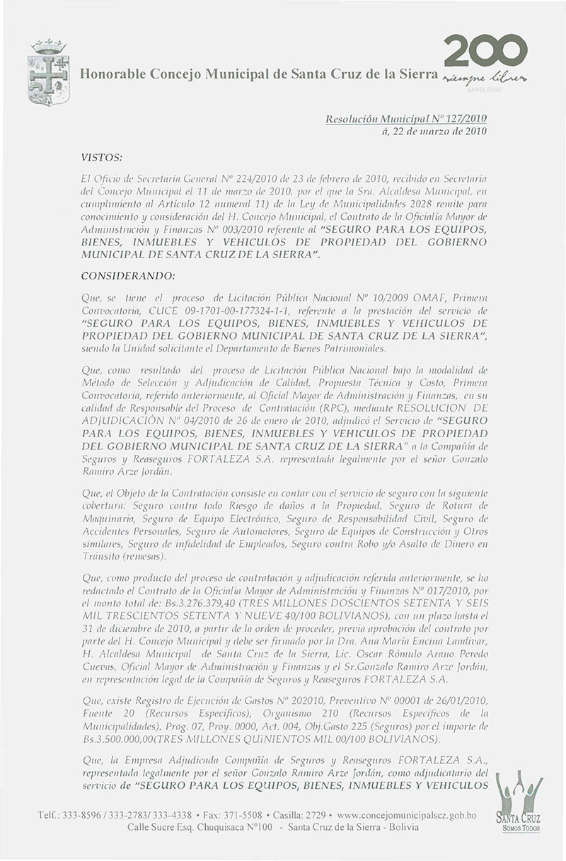 Aprueba el Contrato OMAF Nº 017/2010, referente al Seguro para los Equipos, Bienes, Inmuebles y Vehículos de Propiedad del Gobierno Municipal, por el monto de Bs. 3.276.379,40.