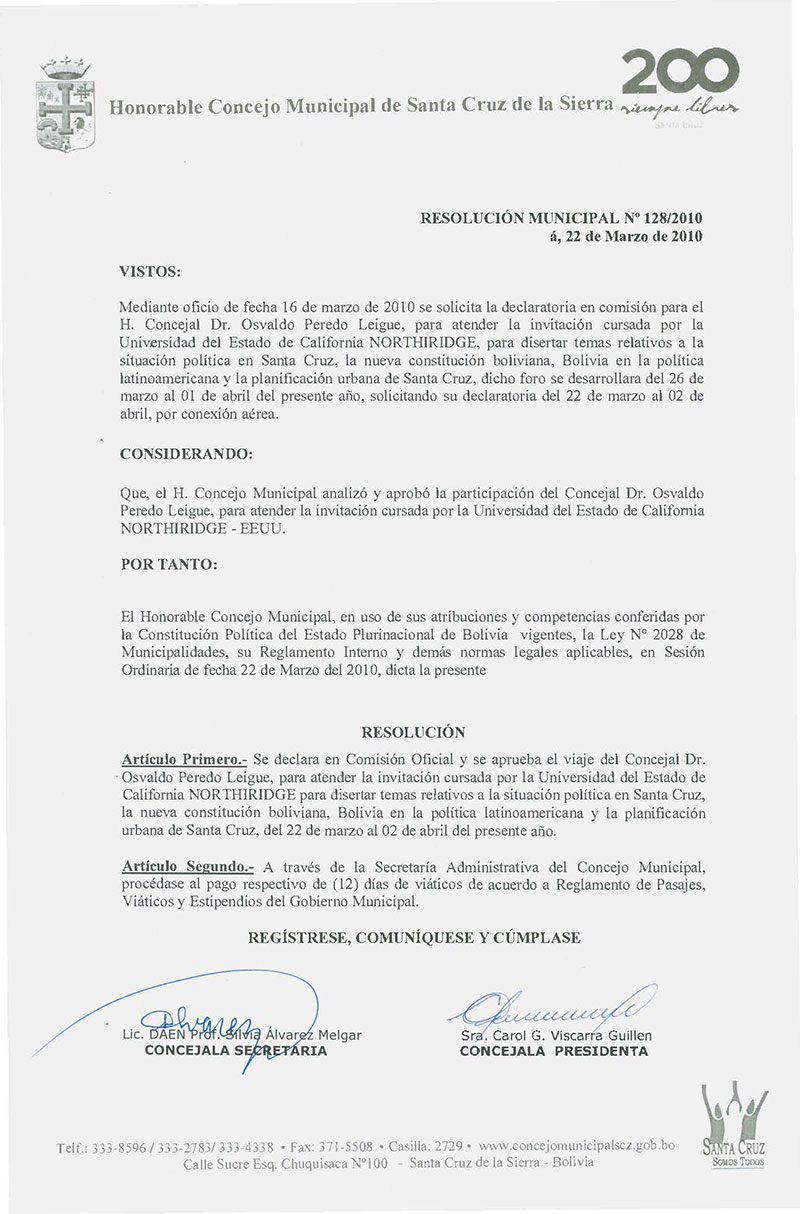 Declara en comisión oficial y aprueba el viaje a E.E.U.U. del Dr. Osvaldo Peredo, a objeto de atender la invitación de la Universidad del Estado de California NORTHIRIDGE.