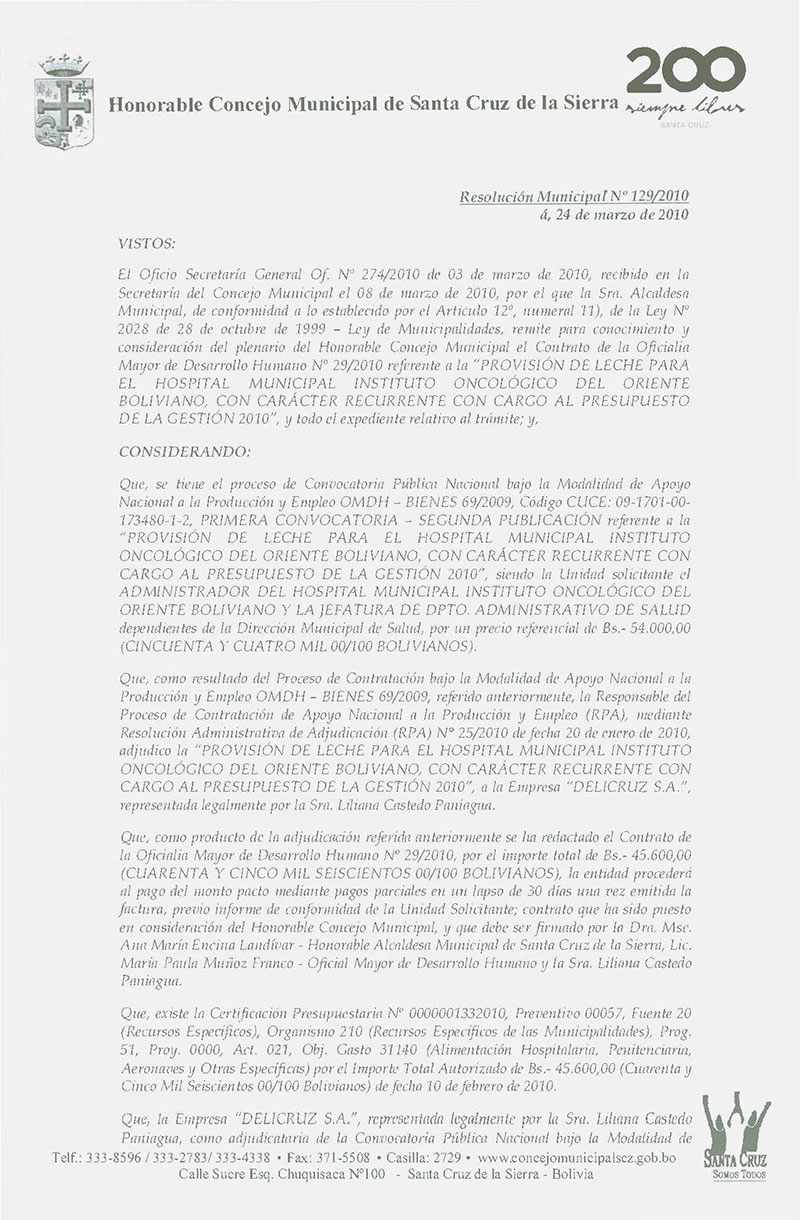 Aprueba el Contrato OMDH Nº 029/2010, referente a la Provisión de leche para el Hospital Oncológico del Oriente Boliviano.