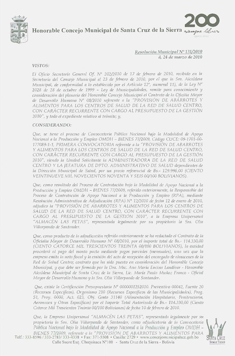 Aprueba el Contrato de OMDH Nº 008/2010, referente a la Provisión de abarrotes y alimentos para los centros de Salud de la Red de Salud Centro, por Bs. 114.330,00.