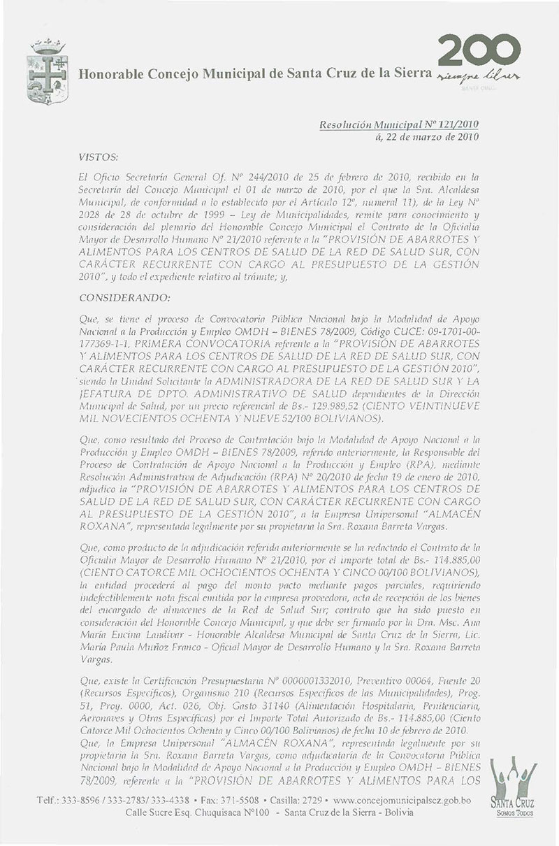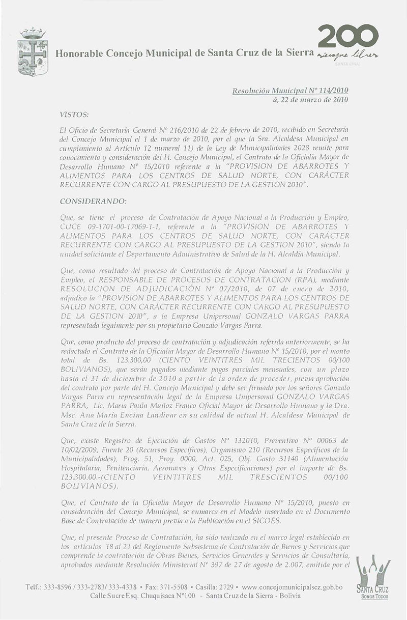 Aprueba el Contrato OMDH Nº 021/2010, referente a la Provisión de abarrotes y alimentos para los Centros de Salud de la Red de Salud Sur, por Bs. 114.885,00.