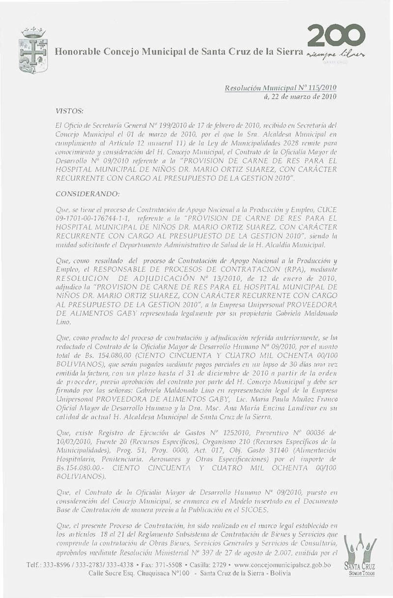 Aprueba el Contrato OMDH Nª 009/2010, referente a la Provisión de carne de res para el Hospital de Niños, por Bs. 154.080,00.