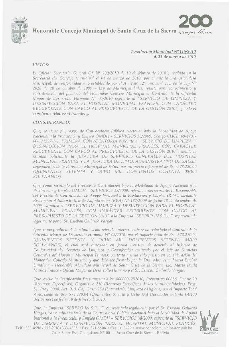 Aprueba el Contrato OMDH Nº 005/2010, referente al Servicio de limpieza y desinfección para el Hospital Francés, por Bs. 578.270,04.