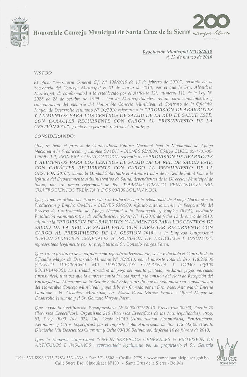 Aprueba el Contrato OMDH Nº 010/2010, referente a la Provisión de abarrotes y alimentos para los Centros de Salud de la red de Salud Este, por Bs. 118.248,00.