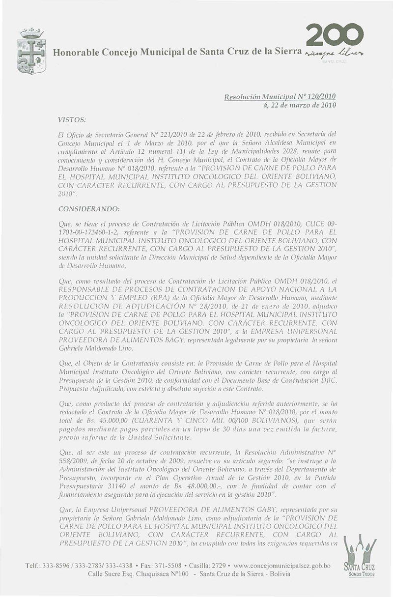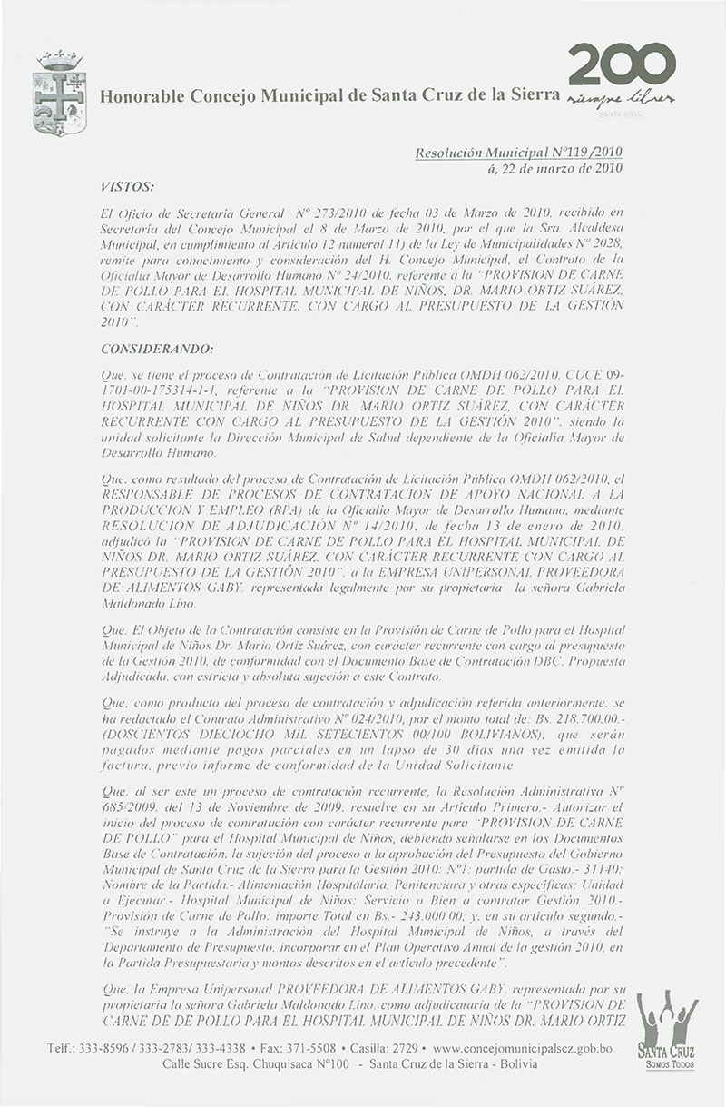 Aprueba el Contrato OMDH Nº 024/2010, referente a la Provisión de Carne de Pollo para el Hospital de Niños, por Bs. 218.700,00.