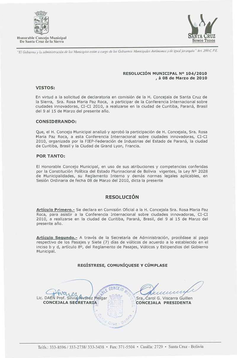 Declara en comisión oficial y aprueba el viaje de la Concejala Sra. Rosa María Paz, para asistir a la Conferencia Internacional sobre Ciudades Innovadoras, a realizarse en la ciudad de Curitiba - Paraná Brasil.