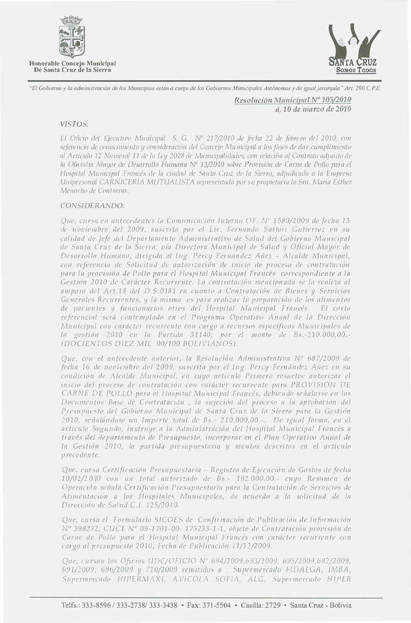 Aprueba el Contrato OMDH Nº 013/2010, referente a la Provisión de Carne de Pollo para el Hospital Francés, por el monto de Bs. 192.000,00.