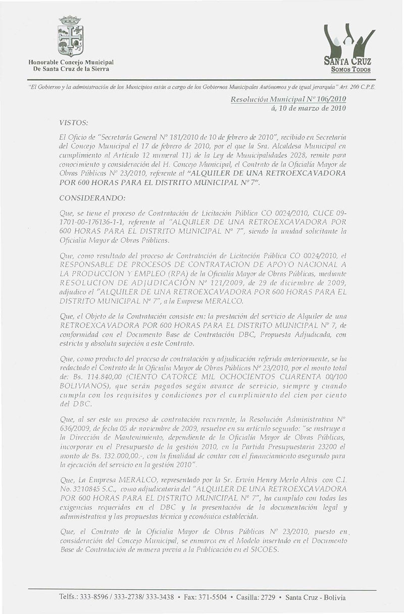 Aprueba el Contrato OMDH Nº 023/2010, referente al alquiler de una Retroexcavadora para el Distrito Municipal Nº 7, por el monto de Bs. 114.840,00.