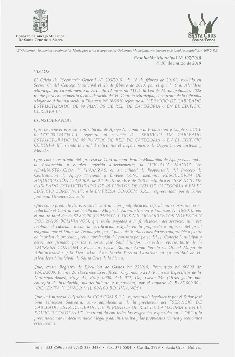 Aprueba el Contrato OMAF Nº 016/2010, referente al Servicio de cableado estructurado de 49 puntos de red de categoría 6 en el Edificio Córdova II, por el monto de Bs. 82.892,20.