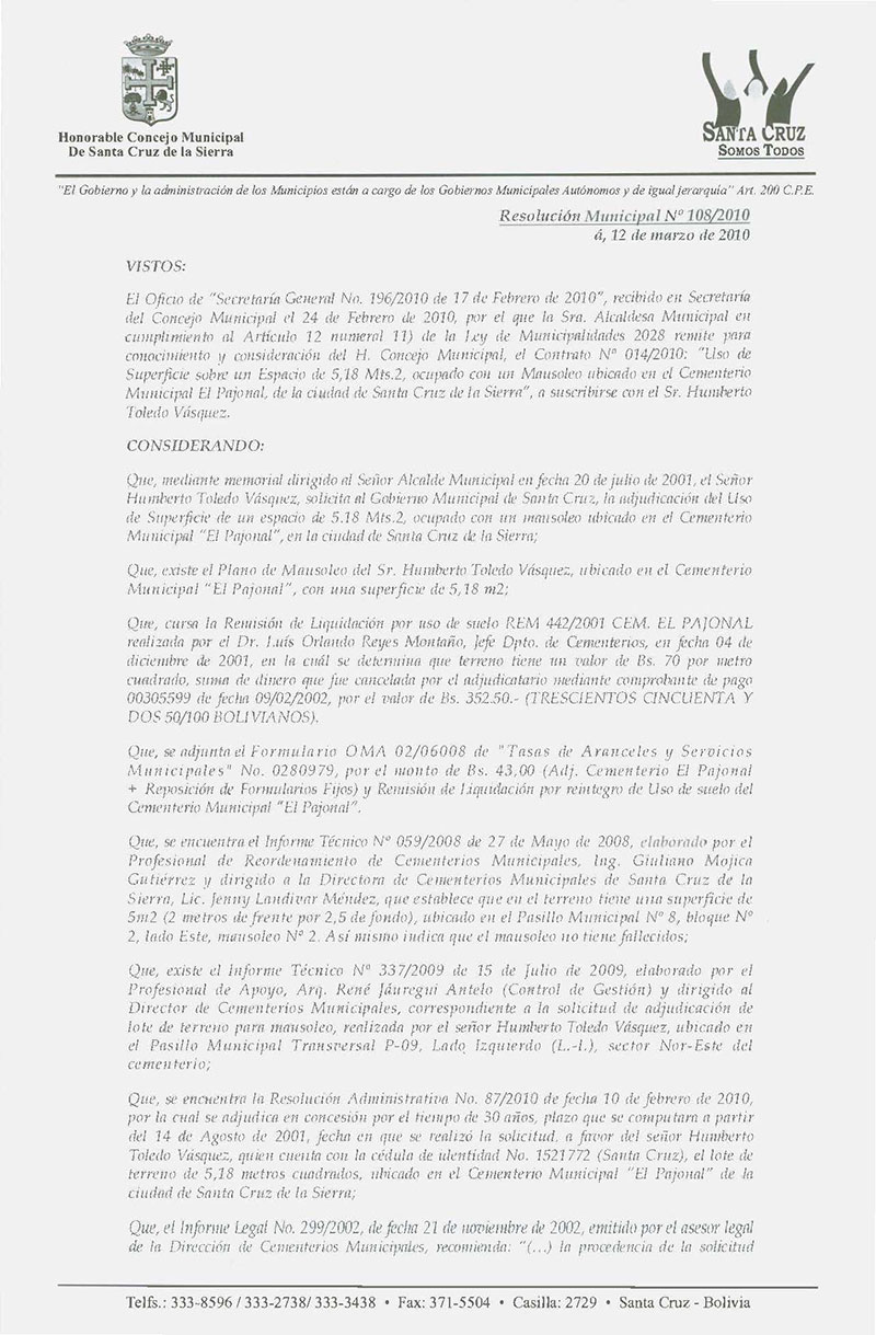 Aprueba el Contrato Nº 014/2010, referente al Uso de Superficie de Terreno, ocupado con un Mausoleo ubicado en el Cementerio Municipal El Pajonal, a favor del Sr. Humberto Toledo Vásquez.