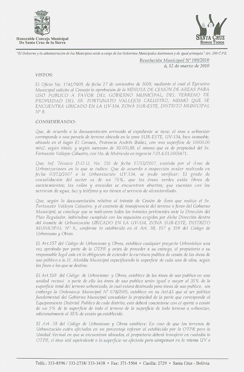 Aprueba la Minuta de Transferencia de Cesión de Área a favor del Gobierno Municipal, ubicado en la UV 134 del Distrito Municipal Nº 9, que realiza el Sr. Fortunato Vallejo Calustro.