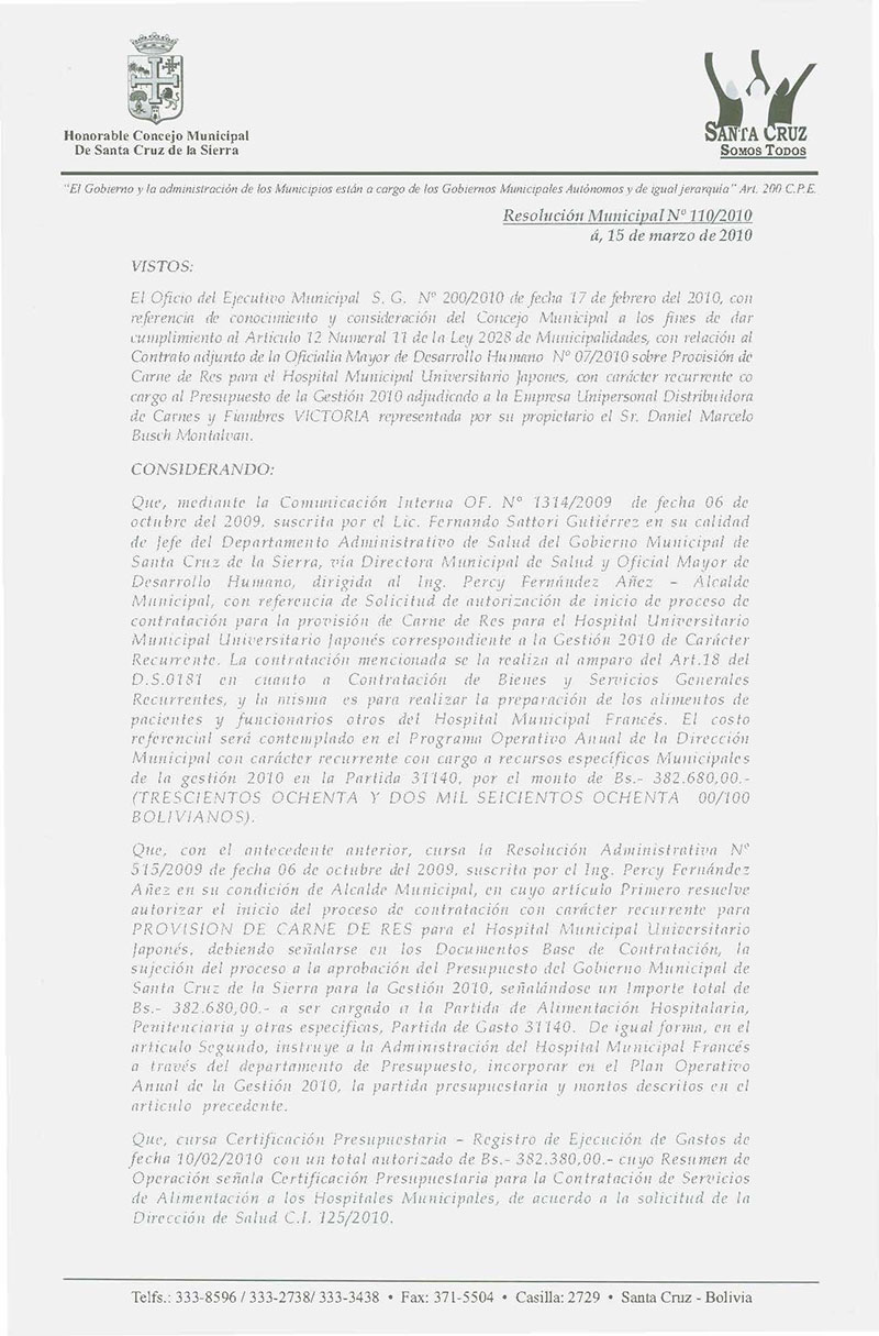 Aprueba el Contrato OMDH Nº 007/2010, para la Provisión de Carne de Res para el Hospital Japonés, por Bs. 382.380,00.