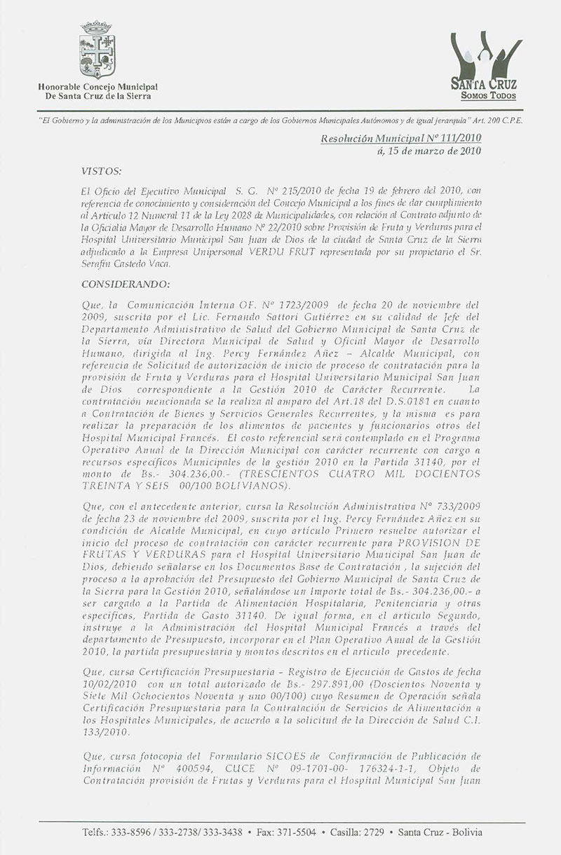 Aprueba el Contrato OMDH Nº 022/2010, referente a la Provisión de Verdura y Frutas para el Hospital San Juan de Dios, por Bs. 297.891,00.