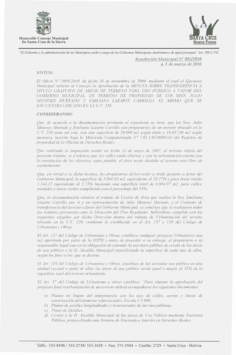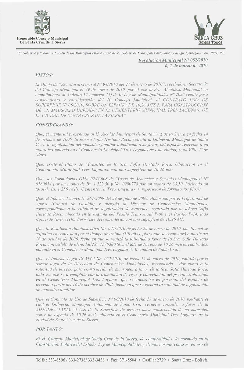 Aprueba el Contrato Nº 006/2010, referente al Uso de Superficie de Terreno, para la construcción de un Mausoleo ubicado en el Cementerio Municipal Tres Lagunas, a favor de la Sra. Sofía Hurtado Roca.