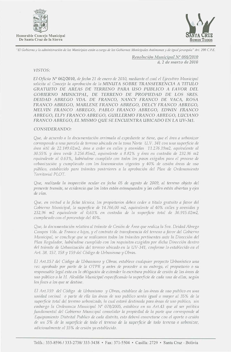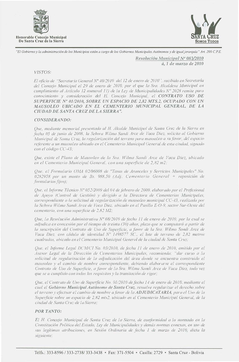 Aprueba el Contrato Nº 001/2010, referente al Uso de Superficie, ocupado con un Mausoleo ubicado en el Cementerio General, a favor de la Sra. Wilma Sandi Arce de Vaca Diez.