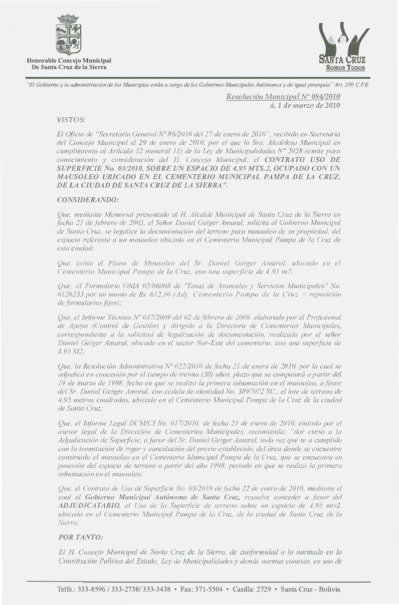 Aprueba el Contrato Nº 003/2010, referente al Uso de Superficie de Terreno, ocupado con un Mausoleo ubicado en el Cementerio Municipal Pampa de la Cruz, a favor del Sr. Daniel Geiger Amaral.