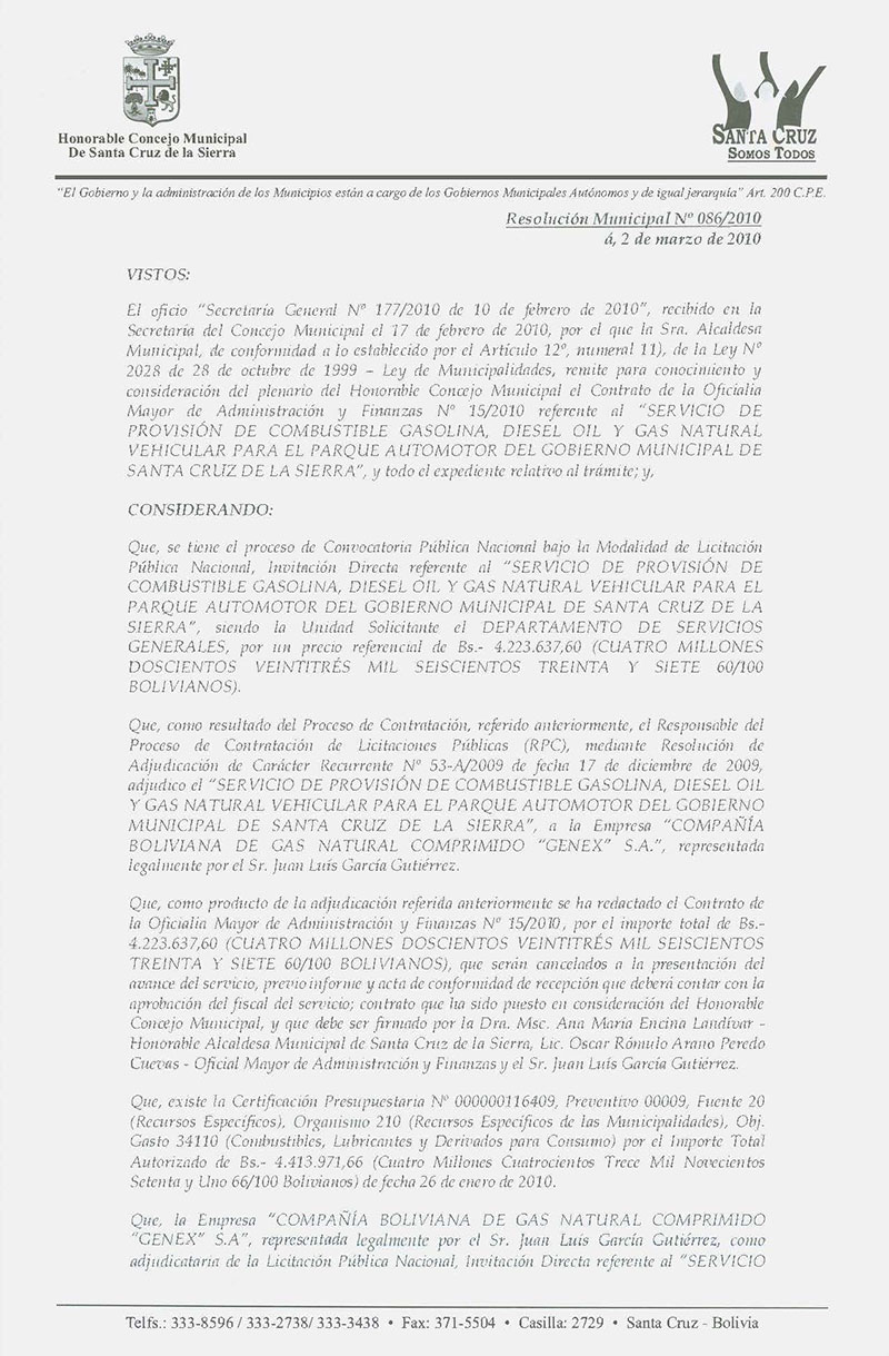 Aprueba el Contrato OMAF Nº 015/2010, referente al Servicio de Provisión de Combustible para el Parque Automotor del Gobierno Municipal, por Bs. 4.223.637,60.
