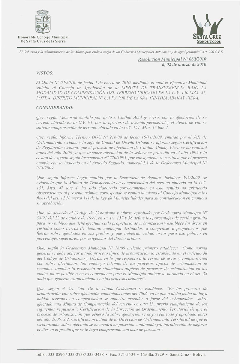 Aprueba la Minuta de Transferencia de Compensación, la superficie ubicada en la U.V. 151 del Distrito Nº 6, a favor de la Sra. Cinthia Abakay Viera.