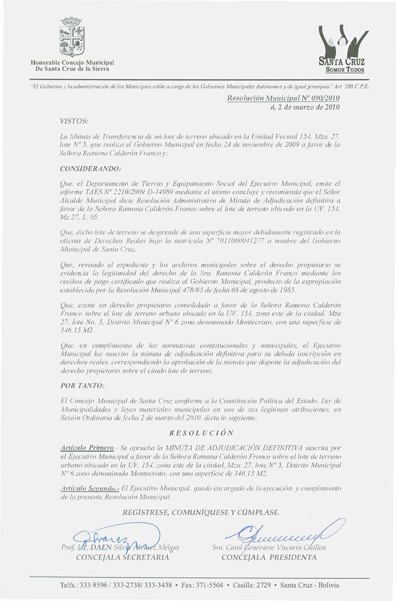 Aprueba la Minuta de Adjudicación Definitiva , la superficie ubicada en la U.V. 154 del Distrito Nº 6, a favor de la Sra. Ramona Calderón Franco.