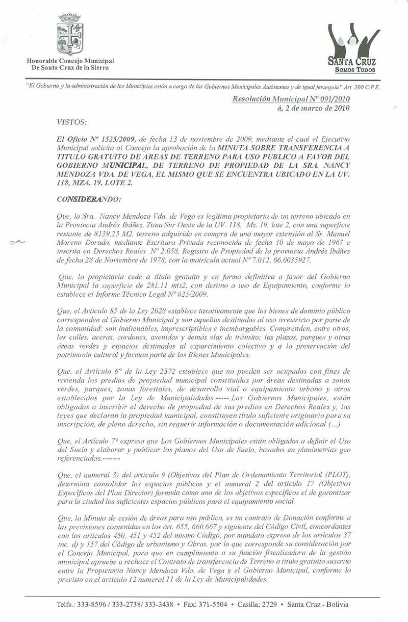 Aprueba la Minuta de Transferencia a Título Gratuito de Cesión de Area, que realiza la Sra. Nancy Mendoza Vda. de Vega, como Bien de Dominio Público Municipal, la superficie ubicada en la U.V. 118 del Distrito Nº 10.
