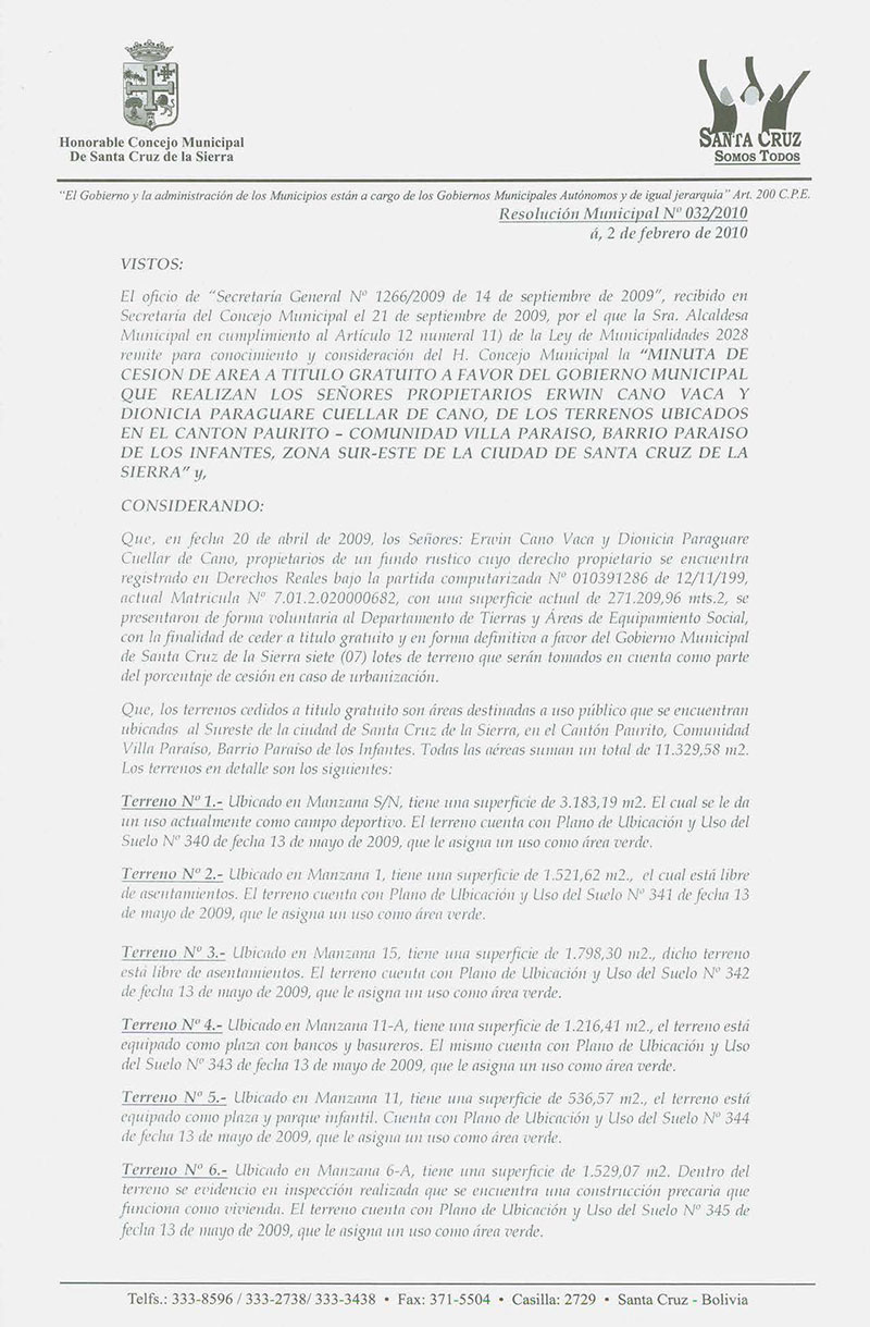 Aprueba la Minuta de Cesión de Área a Título Gratuito a favor del Gobierno Municipal que realizan los Sres. Propietarios Erwin Cano Vaca y Dionicia Paraguare Cuellar, terrenos ubicados en el Cantón Paurito.