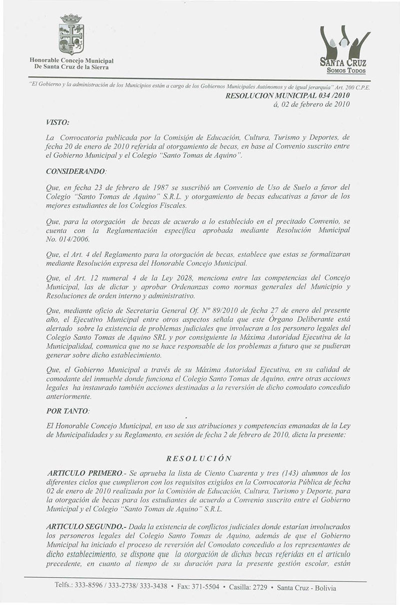 Aprueba lista de alumnos que cumplieron con los requisitos exigidos por la convocatoria realizada por la Comisión de Educación, cultura, turismo y deporte en base al Convenio suscrito entre el Gobierno Municipal y el Colegio Santo Tomás de Aquino".