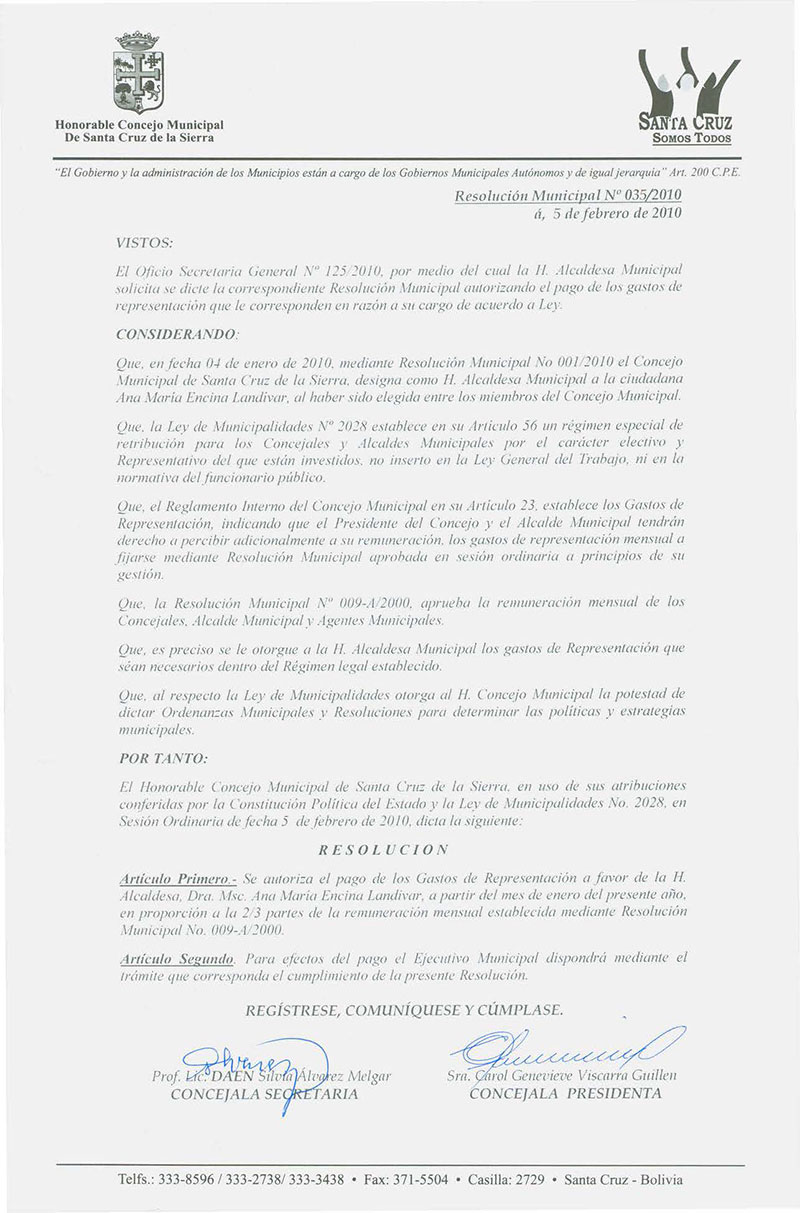 Autoriza el pago de Gastos de Representación a favor de la Alcaldesa Ana María Encina Landivar.