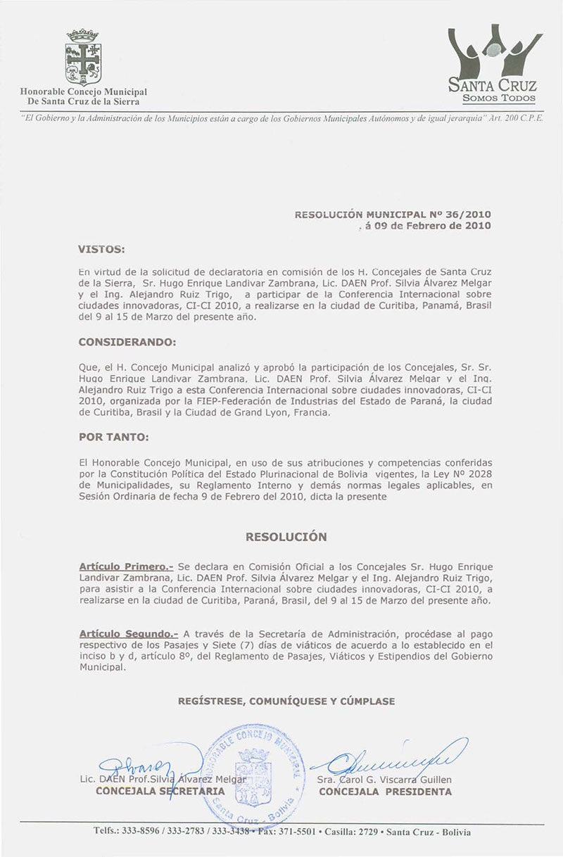 Declara en comisión oficial y aprueba el viaje de los Concejales Enrique Landivar, Silvia Alvarez y Alejandro Ruiz, para. Asistir a la Conferencia Internacional sobre ciudades innovadoras a realizarse en la Curitiba y Paraná - Brasil.