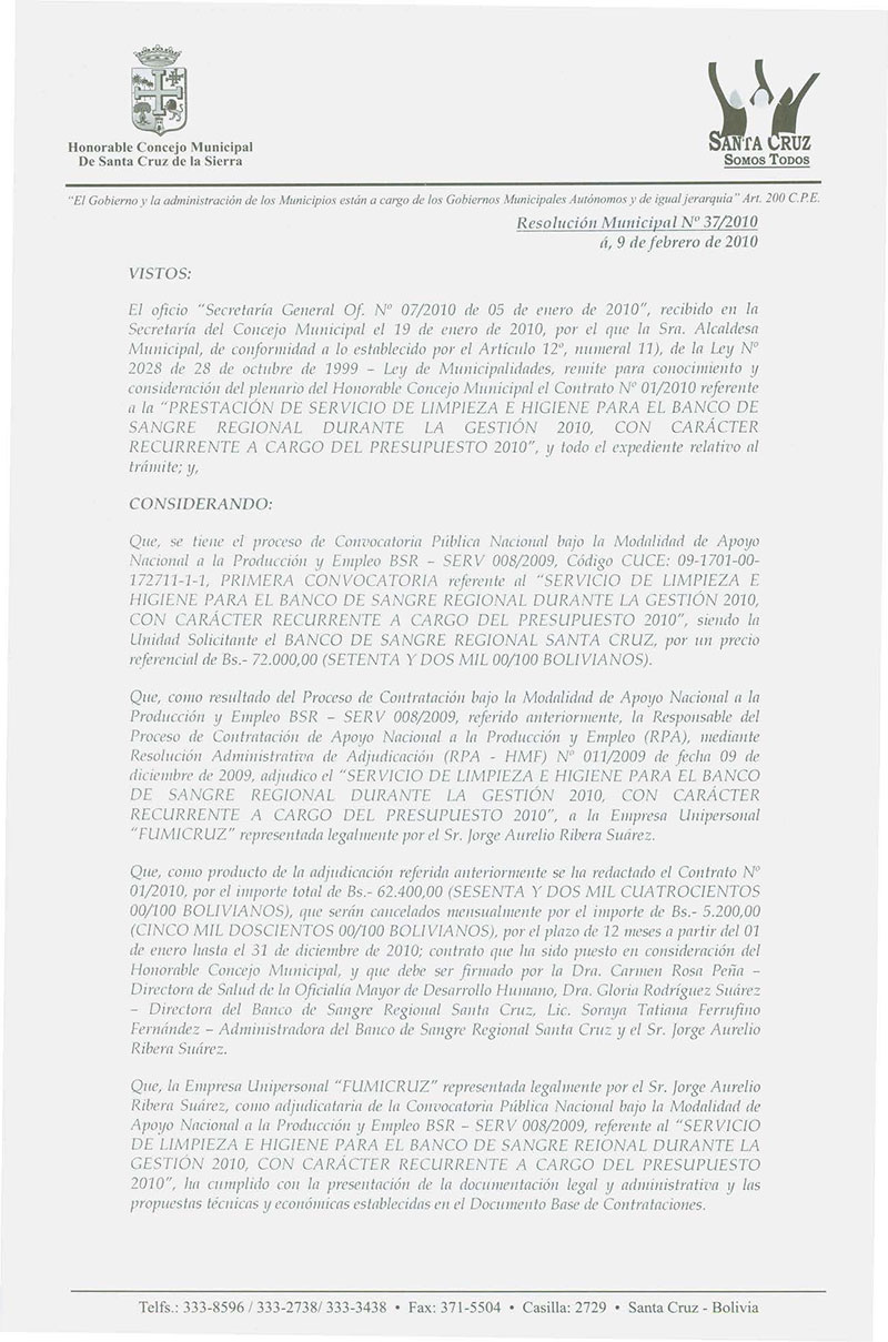 Aprueba el Contrato Nº 01/2010, referente al Servicio de limpieza e higiene para el Banco de Sangre.