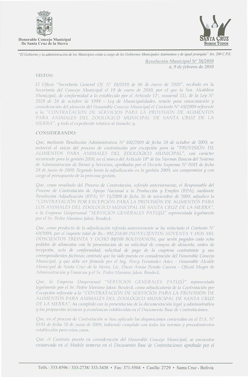 Aprueba el Contrato Nº 069/2009, referente a la Contratación de Servicios para la Provisión de Alimentos para Animales del Zoológico Municipal, adjudicado a la Empresa Unipersonal "Servicios Generales Patujú", por Bs. 992.238,00.