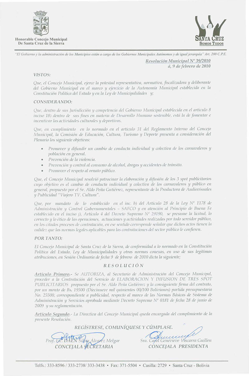 Autoriza al Secretario Administrativo del Concejo, la contratación del servicio para la difusión de spot publicitario, para la Campaña de sensibilización y educación ciudadana para lograr un cambio en la conducta de los carnavaleros.