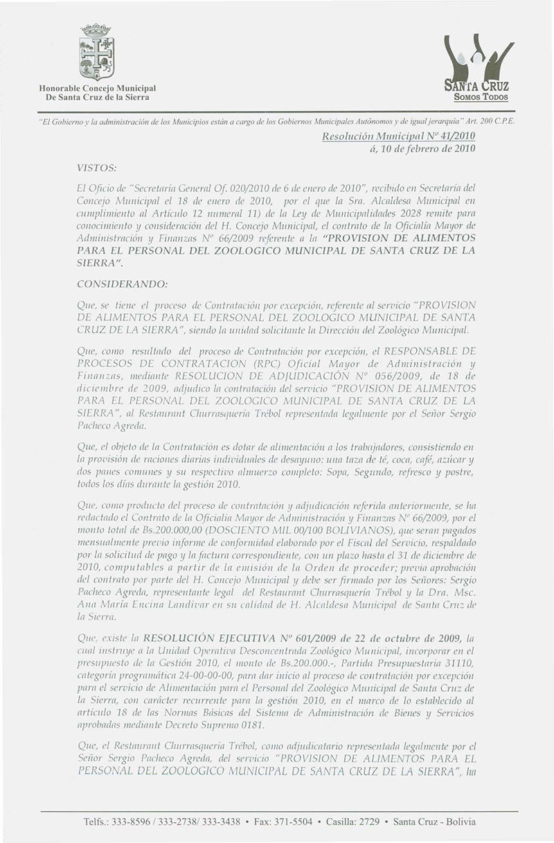 Aprueba el Contrato de la Oficialía Mayor de Finanzas Nº 066/2009, para el servicio de Provisión de Alimentos para el Personal del Zoológico Municipal, por Bs. 200.00,00.