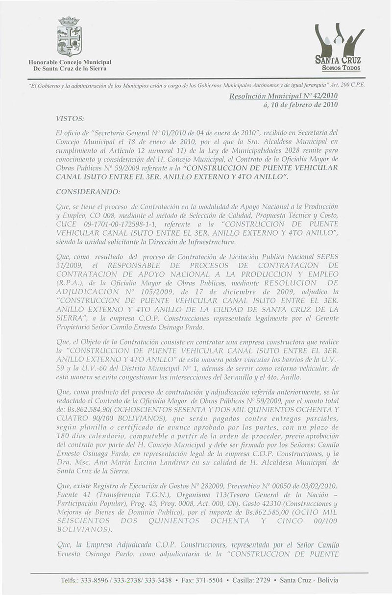 Aprueba el Contrato de la Oficialía Mayor de Obras Públicas Nº 059/2009, para la Construcción de Puente Vehicular del Canal Isuto, por el monto de Bs. 862.584,90.