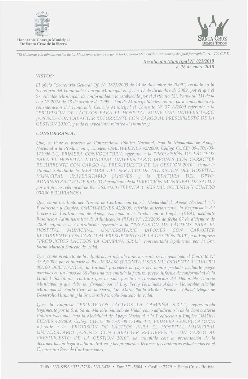 Aprueba el Contrato Nº 037 A/2009, referente a la provisión de Lácteos para el Hospital Municipal Universitario Japonés.