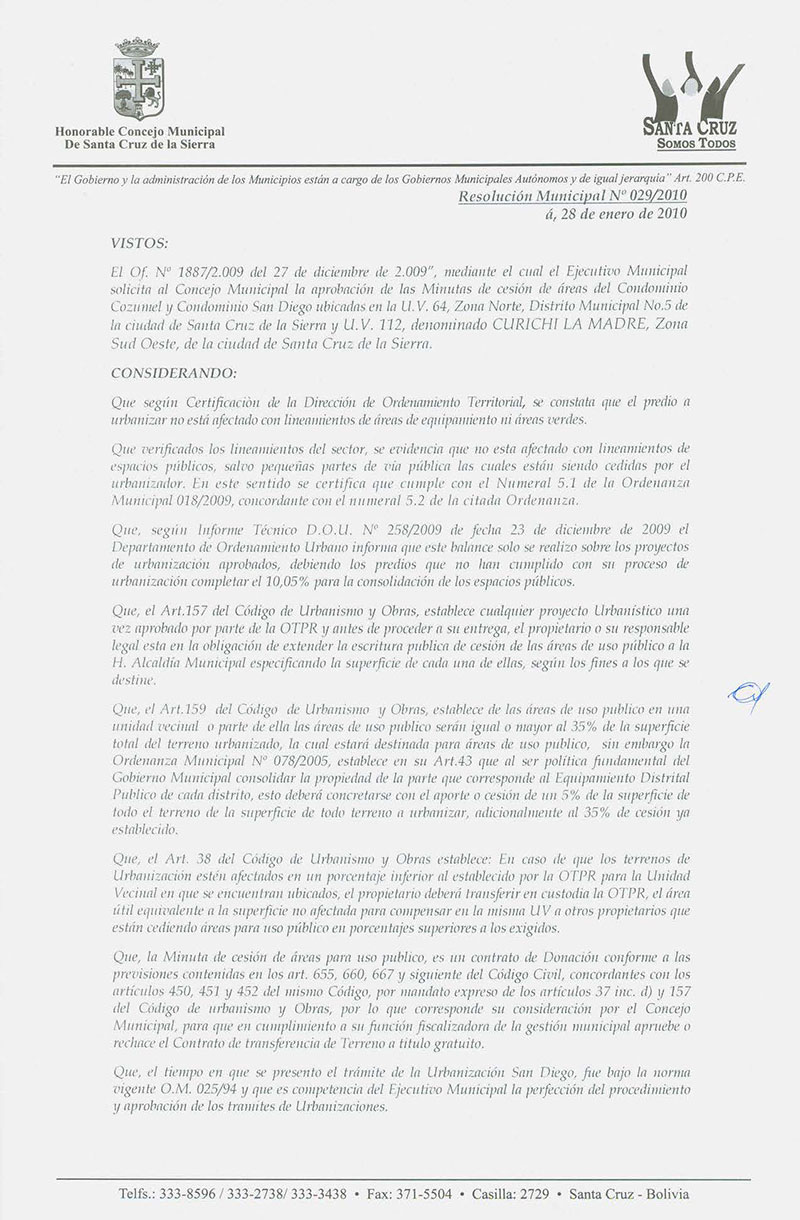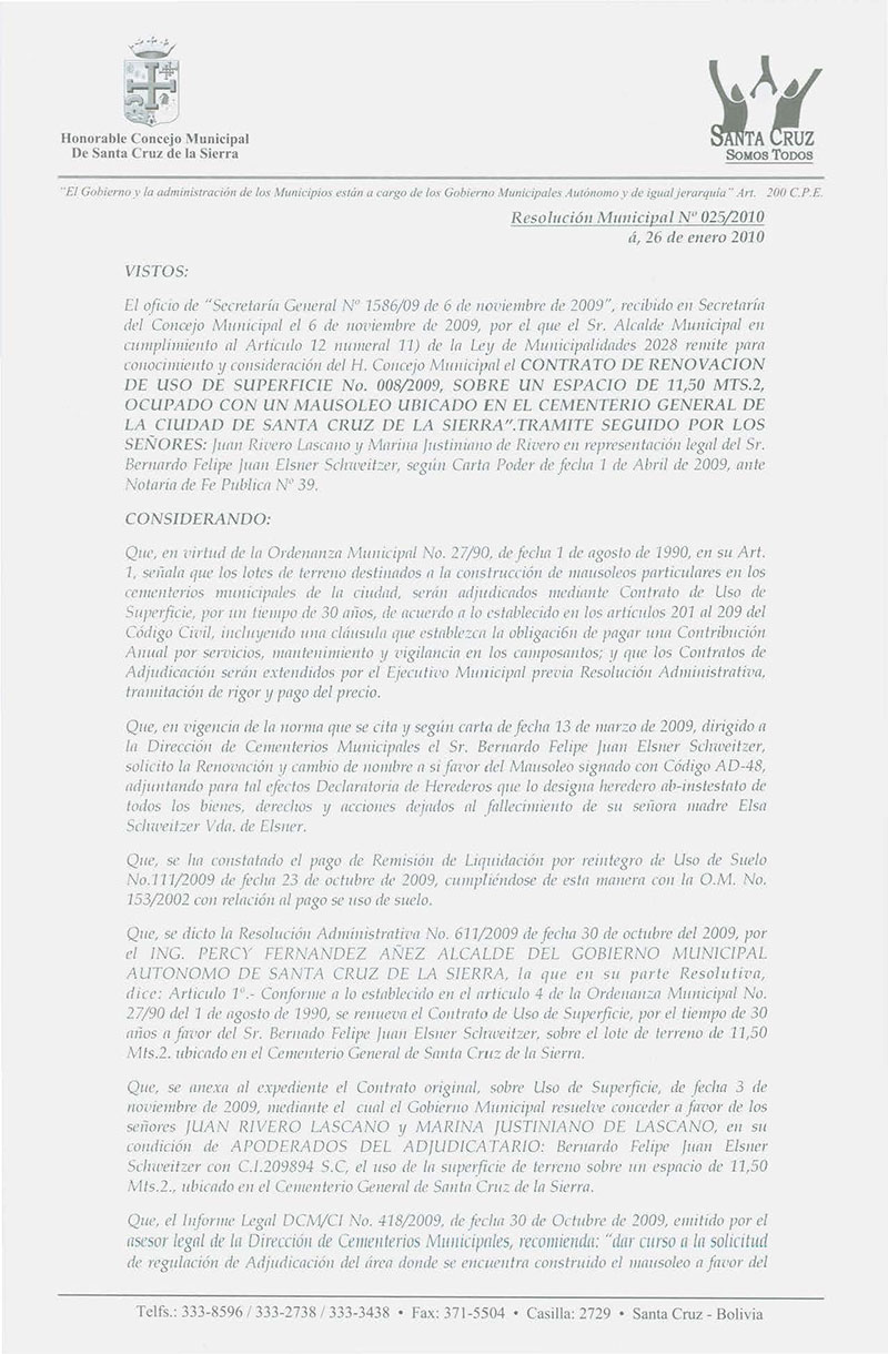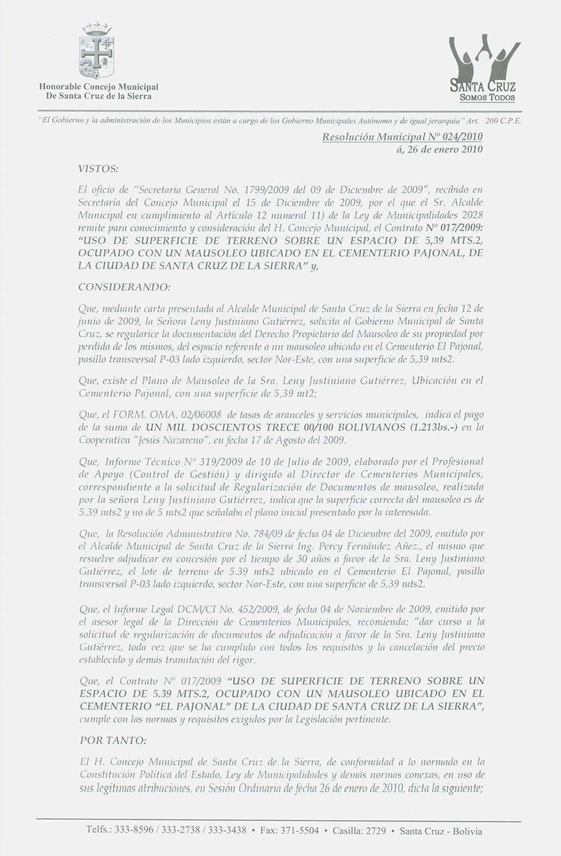 Aprueba el Contrato Nº 017/2009 de Uso de Superficie de Terreno ocupado con un Mausoleo ubicado en el Cementerio Municipal El Pajonal, a favor de la Sra. Leny Justiniano Gutiérrez.