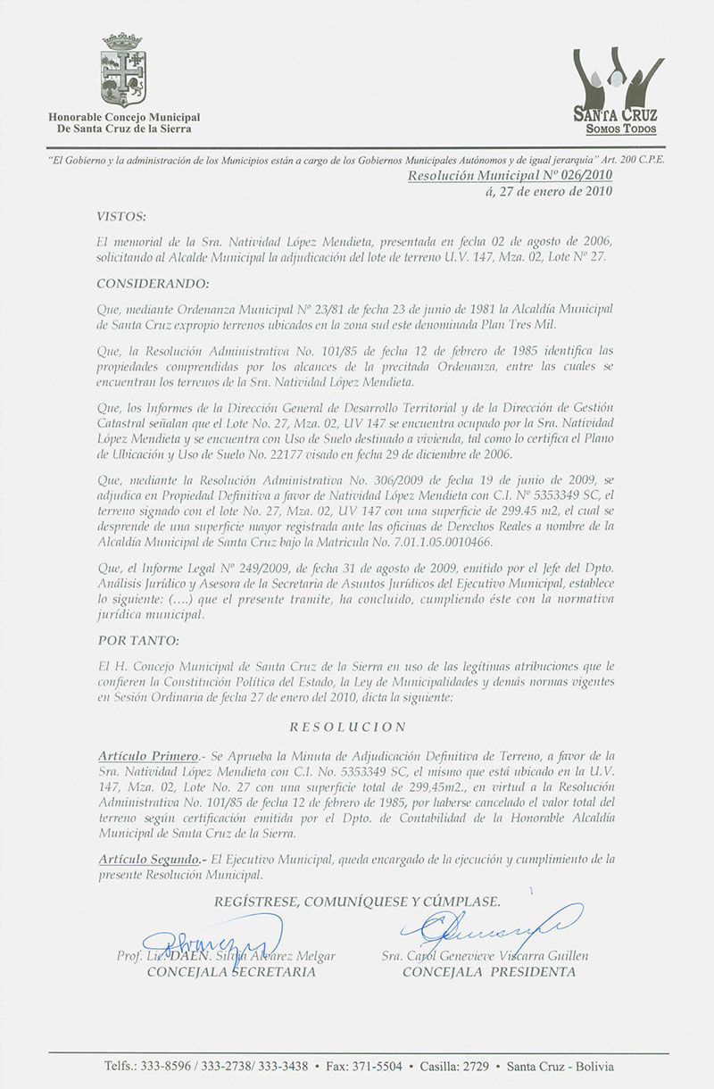 Aprueba la Minuta de Adjudicación definitiva de Terreno, a favor de la Sra. Natividad López Mendieta, el mismo que esta ubicado en la UV 147.