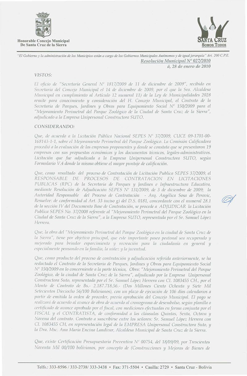 Aprueba el Contrato de la Secretaria de Parques, Jardines y Obras de Equipamiento Social Nº 150/2009, obra de mejoramiento Perimetral del Parque Zoológico Municipal, por el monto de Bs. 2.187.718,56.