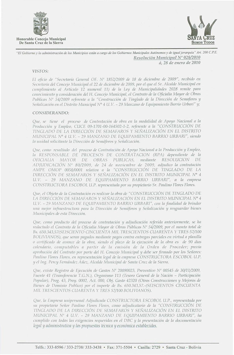Aprueba el Contrato de la Oficialía Mayor de Obras Públicas Nº 054/2009, para la Construcción de Tinglado de la Dirección de Semáforos y Señalización en el D.M. Nº 4, UV-29, por el monto de Bs. 650.343,57.