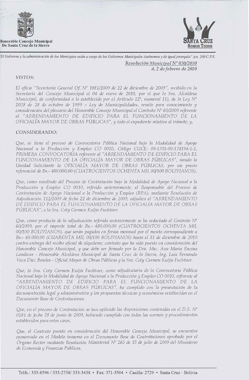 Aprueba el Contrato Nº 060/2009, referente al arrendamiento del Edificio para el Funcionamiento de la Oficialía Mayor de Obras Públicas, por el monto mensual de Bs. 40.000.00., de propiedad de la Sra. Coty Carmen Kuljis Fuchtner.
