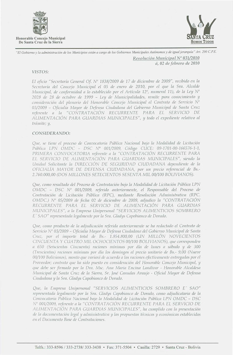 Aprueba el Contrato de Servicio Nº 03/2009, primera convocatoria, referente a la Contratación Recurrente para el Servicio de Alimentación para Guardias Municipales, por el monto de Bs. 1.954.800,00.