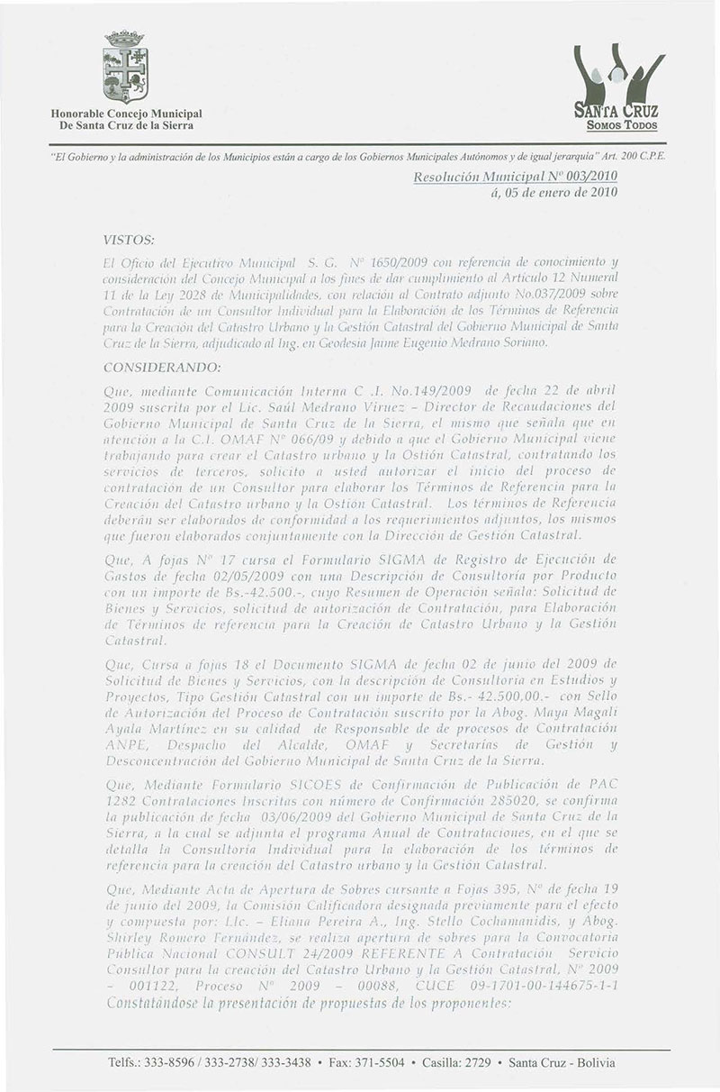 Aprueba el Contrato Nº 037/2009, para la Contratación de un Consultor Individual que elabore los términos de referencia para la Creación de Catastro Urbano y la Gestión Catastral del Gobierno Municipal.
