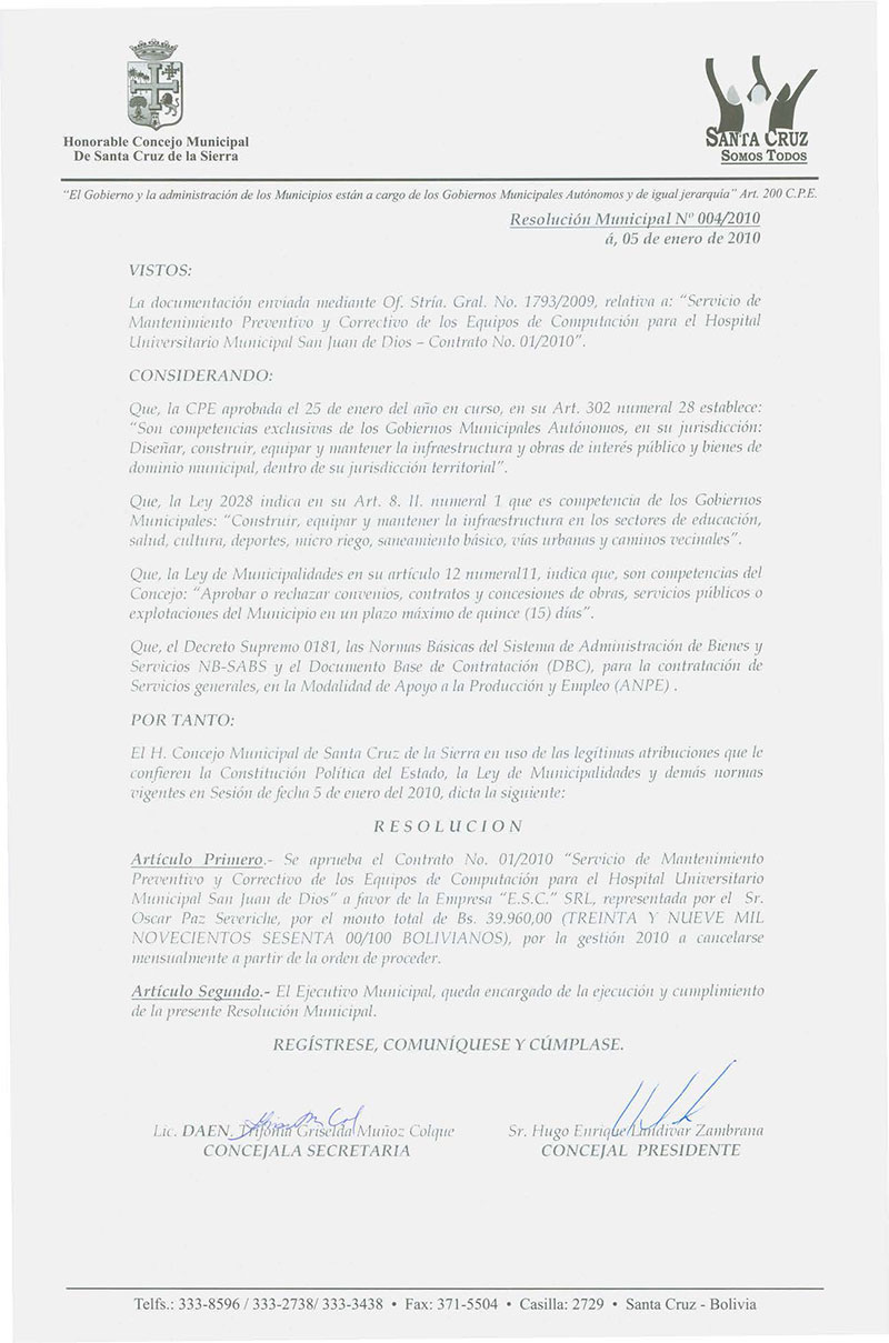 Aprueba el Contrato Nº 01/2009, para el Servicio de Mantenimiento Preventivo y Correctivo de los Equipos de Computación para el Hospital San Juan de Dios a favor de la Empresa E.S.C. SRL.