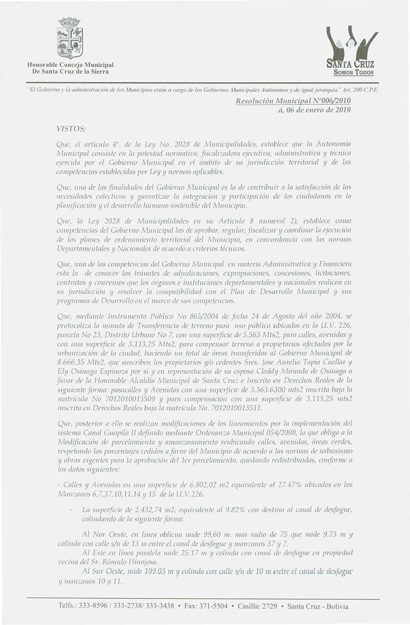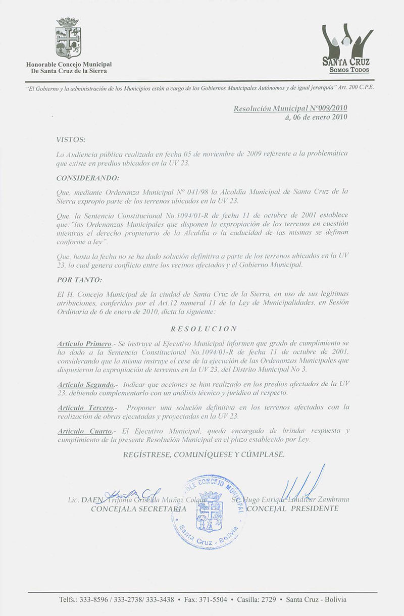 Instruye al Ejecutivo Municipal, que informe en que grado de cumplimiento se ha dado a la Sentencia Constitucional Nº 1094/01-R, al cese de las Ordenanzas que dispusieron la expropiación de los terrenos de la U.V. 23.
